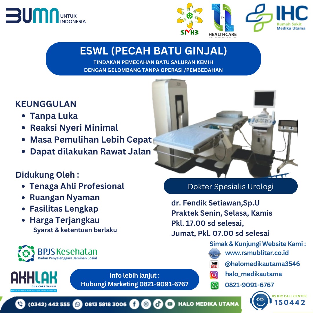 - Tim medis terlatih dan berpengalaman dalam melaksanakan prosedur ESWL dengan tingkat keberhasilan yang tinggi.
