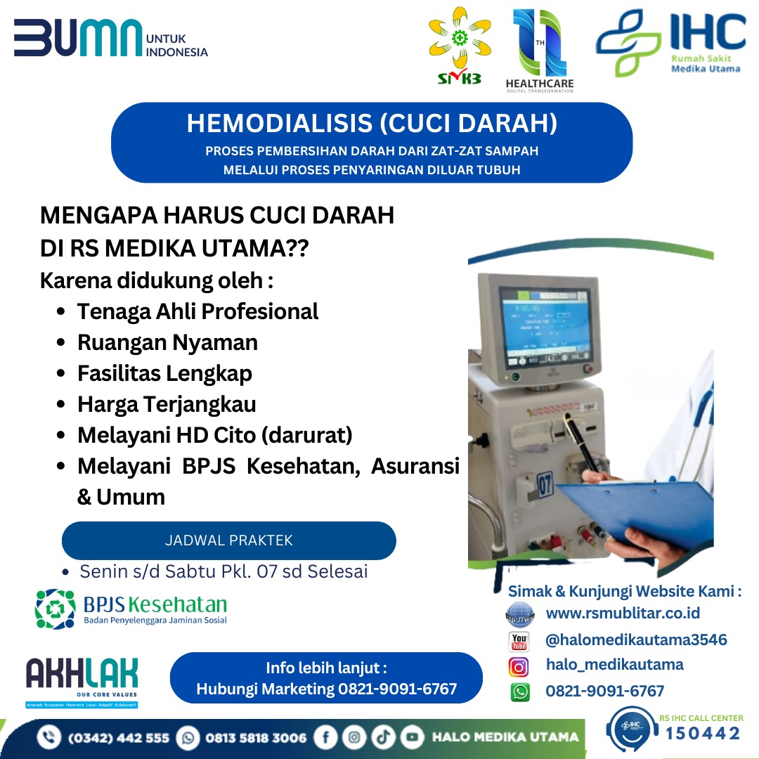 Hemodialisis adalah perawatan untuk menyaring limbah dan air dari darah. Hemodialisis membantu mengontrol tekanan darah dan menyeimbangkan mineral penting, seperti kalium, natrium, dan kalsium, dalam darah. Hemodialisis dapat membantu mengembalikan kualitas hidup, tetapi terapi ini bukan obat untuk menyembuhkan gagal ginjal.